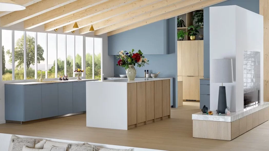 Cette cuisine a été pensée comme un espace de création. Le bleu y règne en maître, apportant apaisement et douceur. L’immense îlot central favorise la transmission et le partage des connaissances. De ses montants travaillés en relief et de son décor chêne clair émanent chaleur et authenticité.