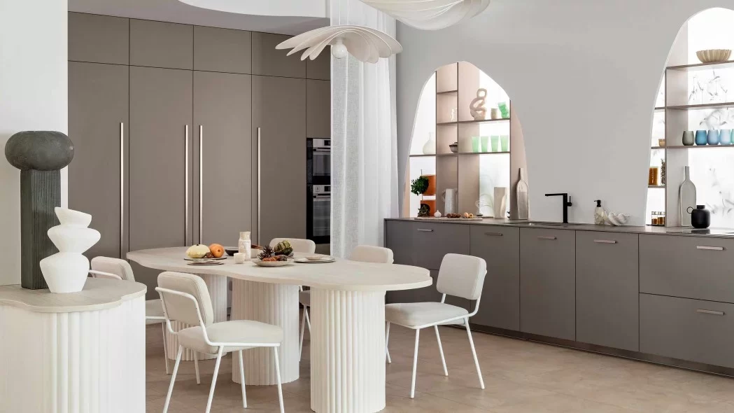 Rêvez votre cuisine en grand ! Dans cette maison d’architecte, l’esprit minéral imprègne les formes organiques de la table et des ouvertures murales. L’immense hauteur sous plafond permet d’accueillir un vaste linéaire d’armoires qui intègre, derrière ses portes pleines, une tisanerie très cosy.